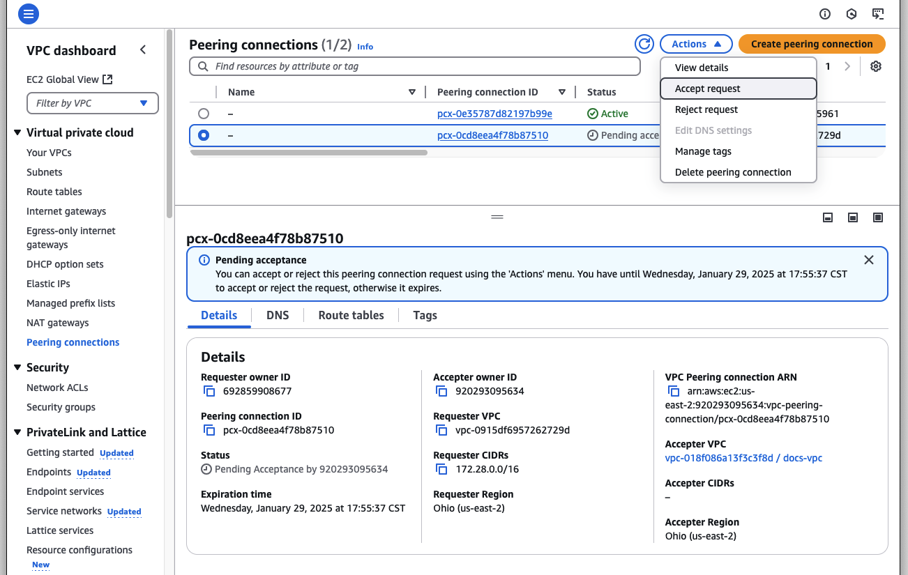When the Network's status changes to Peering initiated, you can click on the Peering Connection ID link to be taken to the Peering connections section of the AWS console, where you should see the incoming peering request.